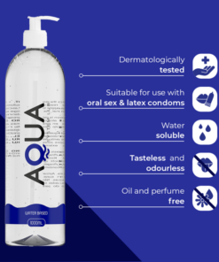 - AQUA ® is also great for use with condoms or just skin-to-skin. Unlike many other water-based lubricants, AQUA ® does not leave a residue. Also, its transparent bottle looks great on your nightstand.