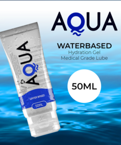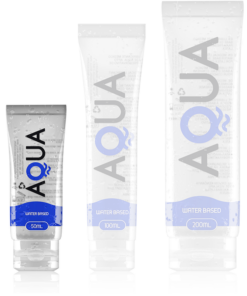 - AQUA ® is also great for use with condoms or just skin-to-skin. Unlike many other water-based lubricants, AQUA ® does not leave a residue. Also, its transparent bottle looks great on your nightstand.
