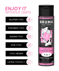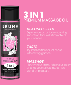 The Premium Heat Effect Massage Oil chewing gum flavor from the BRUMA brand is a true gem in the world of well-being and intimacy. This exquisite product, presented in an elegant 100 ml container, is Designed to provide a unique and sensual experience, providing a relaxing and stimulating massage with a touch of warmth that makes it even more special. here Here are the highlights developed in detail: