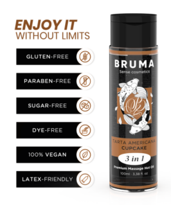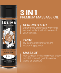 The Premium Heat Effect Massage Oil cupcake flavor from the BRUMA brand is a true gem in the world of well-being and intimacy. This exquisite product, presented in an elegant 100 ml container, is Designed to provide a unique and sensual experience, providing a relaxing and stimulating massage with a touch of warmth that makes it even more special. here Here are the highlights developed in detail:
