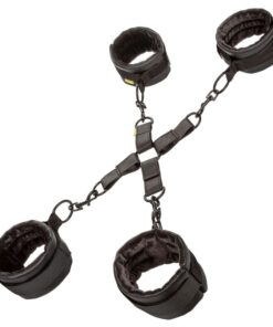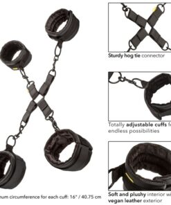 Bind your submissive partner with their hands and feet behind their back (or in the front) and take full advantage of their position. With 2 fully adjustable ankle cuffs and 2 fully adjustable handcuffs bound with Velcro-style hook and loop fasteners, this hog-tie also comes with universal clasps and o-rings with a swivel design for full dexterity and maximum comfort, while being totally bound.