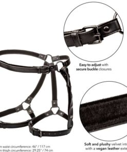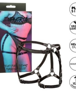Elevate the pleasure with the Multi Chain Thigh Harness from the Euphoria Collection: a premium accessory for intensified desires. Adjustable waist and thigh straps ensure a comfortable fit with a simple buckle closure. The contemporary design ensures durability and improves overall satisfaction. Enjoy the luxurious feel of the soft velvet interior and the touch of sophistication of the vegan leather exterior. The sturdy construction with double padding and stitching ensures comfort during passionate encounters. Non-tarnish metallic accents add glamour, creating a stunning and enticing visual appeal. With its versatile design, it fits most standard sizes. Unleash your desires and explore new levels of excitement with the Collections Multi Chain Thigh Harness