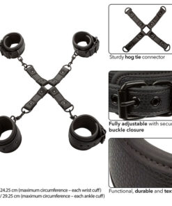 At the core is the sturdy hog tie connector, allowing for various positions and levels of restraint. Universal closures and a swivel D-ring enhance dexterity. Double-stitched for durability, it ensures longevity. The textured finish adds sensory pleasure. Versatile, it can be taken apart to use the cuffs individually.