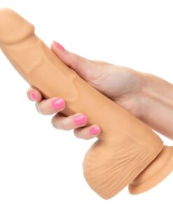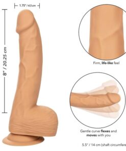 Youre all about the size of your pleasure and the CalExotics Silicone Studs 8 has arrived to deliver a pounding experience fit for any size queen. The real-feel dong is crafted with an ample 8-inch shaft, realistic flexible design, and suction cup base. Deliver the pleasure youve been craving with a 8-inch long dong with sensual tip, textured shaft, and life-like balls. The textured shaft has a firm, yet flexible feel sure to deliver a truly realistic penetration experience. The flanged base has a sturdy suction cup that can be used in a harness or mounted to a flat surface for sensational hands-free fun.