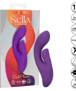 The deep, rumbling power and intimately curved design of the powerful Stella Liquid Silicone Dual Pleaser is sure to leave you breathless. The premium G massager is as thrilling as it is versatile with a uniquely curved tip, dual motors, and 12 rumbling vibration functions. Embrace earth-shaking g-spot stimulation like youve never experienced with the accentuated G stimulator tip and intense dual motor pulsations. This high-powered massager is created with a curved g shaft and a naturally contoured stimulator to hug your most intimate curves. An intense motor inside of the flexible shaft and another inside the teaser provide rumbling vibrations for playfully powerful stimulation. Indulge in personalized pleasure while the curved shaft and teaser shimmy to the rhythm of 12 vibration functions. Control this variety of orgasmic options with the easy-touch control button. The flexible massager is made from hygienically superior liquid silicone for a softer, smoother, more durable, and more flexible feel. Whether youre taking a dip with a lover or indulging in a steamy solo session, look forward to up to 110 minutes of waterproof vibration. Recharge pleasure and get back to playtime in only 2 hours with the provided USB cable. To take your pleasure to-go, a security travel lock feature requires you to hold the on/off button for 3 seconds to turn on or off.