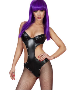 - Black vinyl bodysuit with decorative spikes.