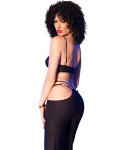 The top, adorned with gold rings, adds a touch of elegance, while the pants, with playful side cuts, subtly reveal the hips, provocatively drawing attention.