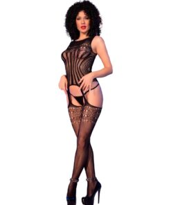 Fine mesh wraps the body like a second skin, and the attached stockings add extra drama: ornate detailing at the top and sleek lower legs for that endless-leg illusion.