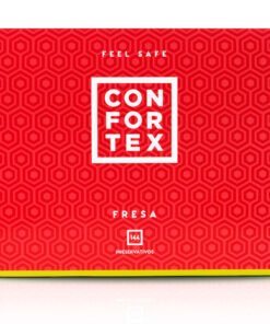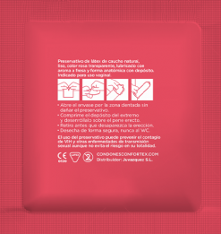 The unit package of CONFORTEX STRAWBERRY condoms, includes the instructions and indications for use and preservation, as well as all information necessary for a safely use.
