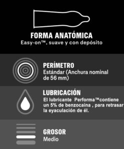 - Contains lubricant Performa with 5% benzocaine which delays ejaculation it