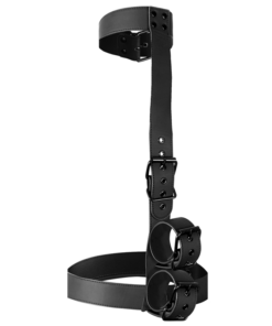 The FETISH SUBMISSIVE Adjustable Neck and Wrist Restraint Harness is a refined choice for those seeking an authentic and safe sensual experience. Made with high-quality, nickel-free vegan leather, it guarantees durability and prevents skin irritations.