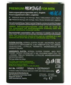 Moringa Oleifera Powder*, Maca Root Powder, Capsule: (Plating Mitt: E 464, Colouring Agent: E141), 11% L-Arginine, Tribulus Terrestris, L-Citrulline, Magnesium stearate (Separating Agent).