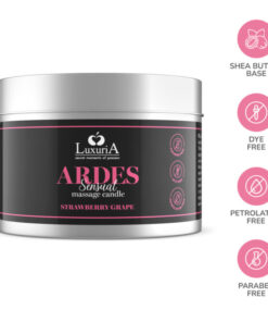 Luxuria Ardes Grape/Strawberry Massage Candle is a scented massage candle made with shea butter, enriched with sensual aromas to intensify and stimulate intimate relationships. The firming and emollient properties of shea butter will provide relief and softness to your skin. The intoxicating aroma of its fragrances will envelop you in warm and sensual moments full of passion and excitement. Ardes will ignite a lustful atmosphere taking you to a sensorial dimension of erotic pleasure.