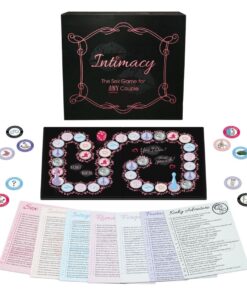 - Includes:Â A game board, 1 die, 2 game markers, 14 sexual reward coins, and 2 question cards for each of the 7 categories: Sex, Intimacy, Intrigue, Romance, Foreplay, Fantasy, and Kinky Adventures.