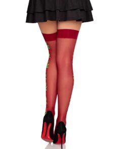 Add a romantic touch with the Burgundy Sheer Tights with Side Rose Embroidery. Made from a luxurious spandex blend, they offer a soft, stretchy fit with a subtle sheen. The red and green embroidered roses add a flirty and feminine touch, making them the perfect detail to complete any bold and playful look.