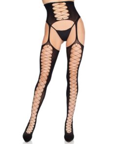 These bold suspender-style tights feature a sheer black finish with striking lace-up cut-out details along the legs and waist. The high-waisted design flatters the silhouette, while the open back and integrated suspender look add a daring, provocative edge. Soft, stretchy fabric ensures a comfortable fit. Ideal for lingerie styling, clubwear, or confident bedroom looks that demand attention.