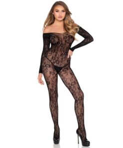 Be captivated by this super-stretchy floral lace bodystocking. This model hugs the body, highlighting your features from head to toe. Thanks to its neckline, it can be worn over the shoulders or in a bardot style. This bodystocking does not have a crotch opening.