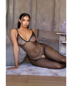 Black fishnet bodystocking with a minimalist and elegant design, featuring a crochet finish. Its crotchless opening and classic mesh texture create a provocative and seductive look for any occasion.
