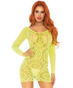 Crochet lace long sleeved mini dress manufactured by the prestigious lingerie brand, Leg Avenue. Increase your feminity getting an exclusive piece of seduction sensuality and elegance.Â