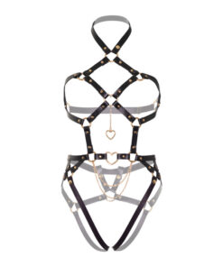 Convertible harness teddy in vegan leather with golden heart rings and chains, studs, a snap-off panty and adjustable straps.