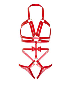 Convertible harness teddy in vegan leather with O-ring studs, a snap-off panty, adjustable straps and cute bow detail. Packaged in a luxury cardboard box.