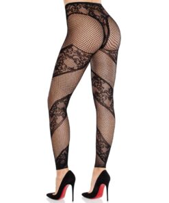 Enhance your legs with Lace and Net Illusion Footless Tights, a stunning fusion of delicate lace and classic fishnet. Designed with diagonal lace panels, these stockings create a striking illusion that contours and enhances your legs, adding an elegant and edgy touch to any look.