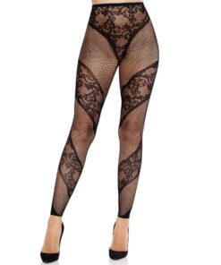 Enhance your legs with Lace and Net Illusion Footless Tights, a stunning fusion of delicate lace and classic fishnet. Designed with diagonal lace panels, these stockings create a striking illusion that contours and enhances your legs, adding an elegant and edgy touch to any look.