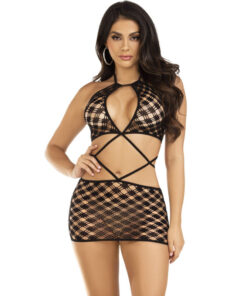 Show off your curves in this ultra-sexy fishnet mini dress from Leg Avenue. Featuring a halter neck crop top with a sultry keyhole design and a mini skirt held together by a strappy wrap detail, this set is sure to turn heads. the attention. Bold and versatile, this racy lingerie look will heat up your mood. things in the bedroom or will it serve as a flirty swimsuit by the pool.