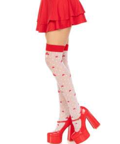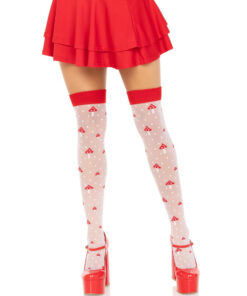 - Sheer spandex thigh-high stockings with polka dots and mushrooms