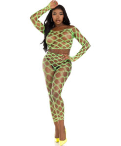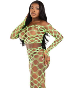 The 2-piece hardcore fishnet crop top with footless stockings is a bold and seductive choice for those looking for a provocative and daring look. This lingerie set combines style and sensuality to create a stunning and memorable look.