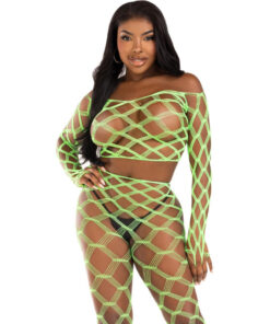 The 2-piece hardcore fishnet crop top with footless stockings is the perfect option for a special night or to surprise your partner. Its bold and seductive design will make you fall in love. You will feel confident and powerful, while its softness and elasticity will keep you comfortable and ready for any intimate occasion. It is the ideal choice for those who want to express their sensuality and style with confidence and boldness.