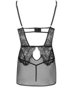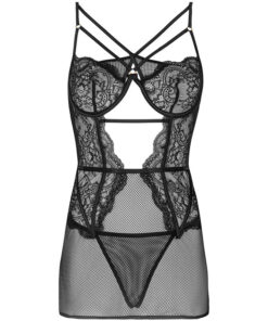 The Baririn Rissarin Collection model is a set consisting of a T-shirt and thong in a timeless black color. The outfit is based on a sensual combination of elegant lace and mysterious mesh, which simultaneously covers the body and attracts the eye. The thong from the set has a classic cut, which is only a background for a phenomenal nightgown with a sophisticated cut. The Baririn Rissarin Collection model stands out thanks to decorative stripes on the neckline and cutouts under the bust and on the back. Revealing pieces of naked skin, the T-shirt ignites the senses and arouses desire.