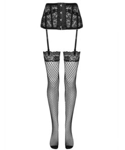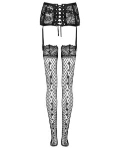 The Jelly garter belt is a sensual set of underwear from the LivCO Corsetti Fashion collection. It includes a garter belt with stockings. The whole thing is finished in an elegant black color. The garter belt is made of fine lace. It covers the body from the hips to the waist. Its width makes it look extremely impressive and optically shapes the figure. The belt also has vertical stitching that gives it a predatory character and optically slims it. Tempting decorations in the form of diagonal inserts made of shiny material are studded with silver decorative elements. The front of the garter belt is fastened with comfortable hooks. The alluringly cut-out back above the buttocks is equipped with a corset lacing. Fishnet stockings with large meshes are attached to the waist with narrow, adjustable straps. Their upper part is decorated with lace with a floral ornament. The set is made of flexible material that adapts to the shape of the body and emphasizes the figure. .