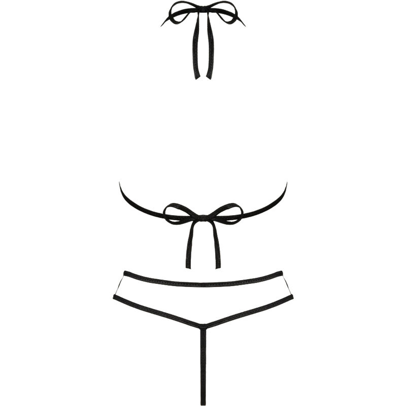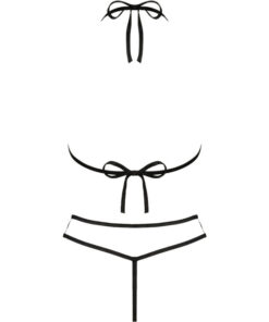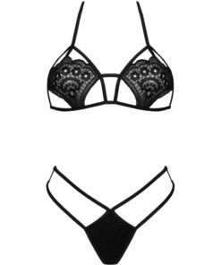 Jimena’s unusual and spicy set consists of a bra and matching thong. The black straps further accentuate her seductive character.