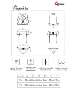 The set consists of a bra, panties and a garter belt that will look great on both slim and slightly curvier figures. The cut of the set perfectly masks minor figure imperfections around the hips and belly. The bra delights with unusual straps and sensual lace, and thanks to the underwires, it effectively lifts the breasts and shapes them beautifully. In turn, the panties give a perfect shape to women’s hips and ignite the senses thanks to subtle cutouts. The set is made of soft and flexible lace. The material is pleasant to the touch, stretchy and adheres well to the body. The lace does not scratch or restrict movements, allowing you to maintain complete freedom and comfort. The black material looks good on any skin tone and is completely universal, suitable for any occasion.