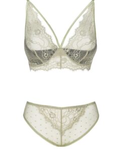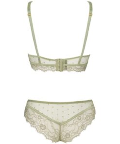 The lingerie set is a lace work of art. The bra is not stiffened and is additionally equipped with two straps on the neckline, so when peeking out from under a shirt or blouse, it will certainly attract great attention. The bra supports the bust well, which means that women with larger breasts will also be able to wear it. Tempting underwear in off-green color also includes comfortable and at the same time sensual lace panties, which, even though they are slightly more built, still create a sexy atmosphere. The design of the panties perfectly highlights women’s buttocks, making every woman feel special. The set is perfect for everyday wear as well as for slightly more special moments.