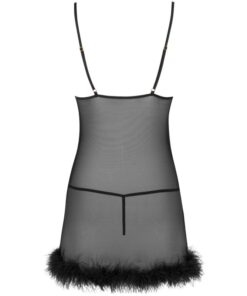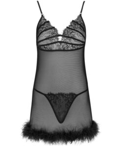 Zerunam is a product made from a mixture of polyamide and elastane, a very soft and pleasant to the touch material that adapts well to the body. The shirt does not scratch the skin, does not restrict movement and guarantees complete comfort of use. The set adapts to the shapes of the figure, but is not tight. Koszula reaches behind the thigh line, emphasizing the buttocks. The sophisticated black finish of the can makes the entire set look extremely flirtatious.