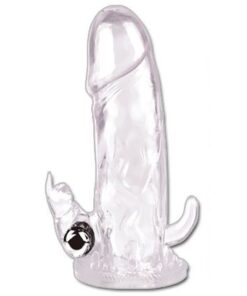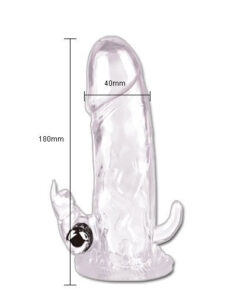 This penis extension sleeve has a solid tip to give you that extra length whenever you want it. Use the bullet on top to stimulate your clitoris or use it on the bottom to stimulate your balls. Supplied with batteries. One size fits most.