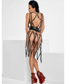 - Amazing, long, suiting “coat” made of ecoleather straps, hand pressed silver studs and silver rings.