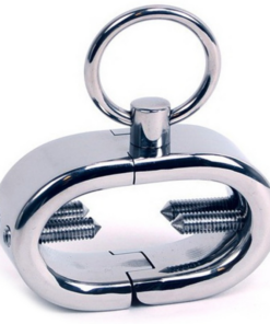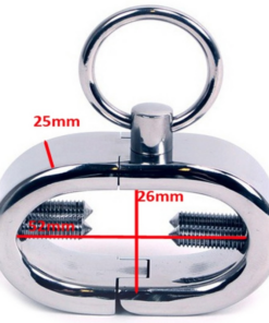 Oval shaped metal testicle cuff designed to fit perfectly around the scrotum between the base of the penis and the testicles. With four screws to apply pressure that can be adjusted with the included allen key and with a ring to attach and complete other fetish games.