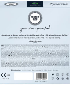 MISTER SIZE gives you a completely new sensation during sex while offering optimal safety. All our MISTER SIZE condoms comply with DIN EN ISO 4074:2002 and are subject to thorough testing. Having a condom with optimal safety creates confidence and security that allows both of you to relax and let yourself go completely during sex.