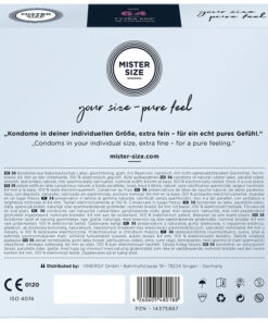 With MISTER SIZE 64 you have the condom that gives you a pleasant feeling in every sense. Pinching, pinching and the feeling that your manhood is being suffocated are a thing of the past! From now on, pure pleasure begins. Just before making love, a wonderful union is created by easily pulling the condom onto your strong and robust penis – a union that will create wonderful moments of sensual pleasure. Easy and perfect fit with your personal condom size No matter what has happened in the past, a condom can and should always fit perfectly! With your personal size, your MISTER SIZE condom warmly embraces your penis like a second skin and makes a natural feeling possible. You can now relax and finally let yourself go completely during sex.