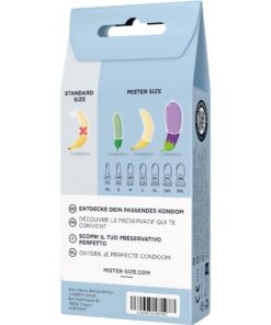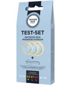 Find your size with the size test kit. The MISTER SIZE test kit, with measuring tape and medium trial pack, helps you discover your ideal condom size. The sizes 53 mm, 57 mm, and 60 mm included in the kit cover the most common ones. If you use a different size, you can check it with the measuring tape and feel the difference with the medium trial pack.