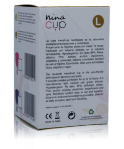NINA CUP is your menstrual cup. Innovative, comfortable and environmentally friendly, NINA is the ideal solution for your intimate hygiene. Made in 100% medical grade Sillicon, its tolerance is optimal, allowing prolonged use up to 12 hours.
