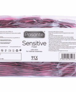 Pasante Sensitive Feel condoms are ultra-thin for intense contact. Smooth, parallel, natural color and with a teat tip. Each condom is Made with a thickness of 0.053 microns, up to about 25% thinner than regular condoms.