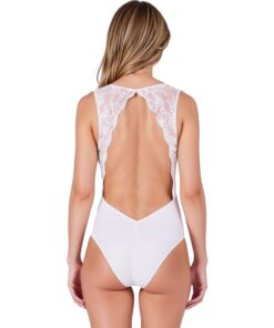 - Style: Bodysuit with a deep V-neckline at the front and an open back with lace details