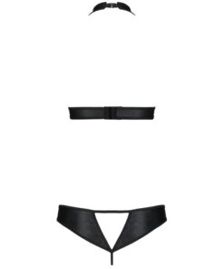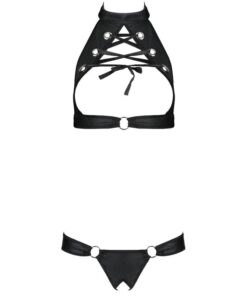 Malwia is a set consisting of a leather top attached to the neck with decorative rings and laces, which emphasizes and enhances the bust and the thong with a charming cutout. The decorative joints in the shape of circles give a peculiar charm.