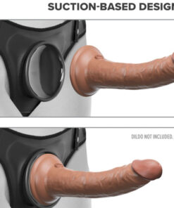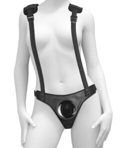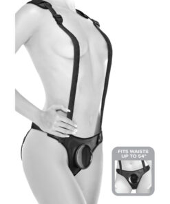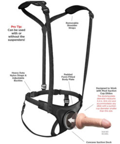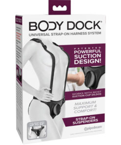 The patented Body Dock Strap-On Suspenders take strap-on play to a whole new level! Theyre not just stylish, but they also provide maximum support and comfort with the padded form-fitted body plate, detachable suspenders, adjustable side-release buckles, and removable shoulder pads. Changing your favorite strap-on accessory has never been faster or easier! Its as simple as attaching the suction cup on your favorite dildo or vibrator to the docking plate, while the nylon straps easily adjust to fit most sizes and body types. Best of all, it works with most dildos on the market today, including some you may already own. No rings. No snaps. No hassle!