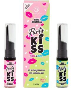 Oral sex and foreplay are truly exciting, but with an extra touch, they can become your favorite activity. Flirty Kiss consists of two gels: one strawberry gel with a spicy warming effect and one mint gel with a vibrant cooling sensation. Both are perfect for couples to use together. One partner will experience an exciting strawberry warmth and a stimulating spicy effect, while the other will feel a vibrant, refreshing mint sensation. An explosion of sensations for unforgettable kisses and oral sex.