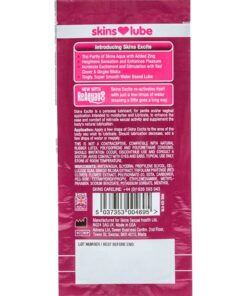Skins Excite has all the fun and benefits of Skins Aqua lubricant, but with an extra touch of pleasure. With L-arginine, it increases blood flow to the area of application. This intensifies sensation in women and provides a firmer erection in men. Packed with natural ingredients that will make your erogenous zones tingle. We took the Skins Aqua formula and added the aphrodisiac properties of red clover and ginkgo biloba. The result: a lubricant with an irresistible tingling sensation that boosts arousal and takes you to new heights. Passion and pleasure in perfect harmony!
